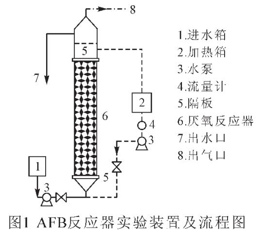 實驗裝置。實驗采用的厭氧流化床反應器示意圖見圖1。試驗裝置包括進水箱,進水泵,厭氧流化床反應器,加熱箱,回流泵等。厭氧流化床反應器主體結構為透明有機玻璃管制成,便于觀察反應區內載體流化情況和產氣等反應情況。反應器總體高度1600mm,反應區高度1180mm,反應器直徑90mm,有效容積7.5L。為了生化反應的高效進行,采用對回流水加熱,試驗采用一臺TDW-2002型自動溫度控制儀控制加熱箱內的廢水。