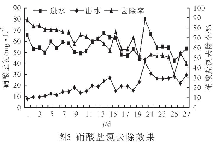 由圖5可知,進水硝酸鹽氮為42.21~79.98mg/L,平均為55.83mg/L,出水中硝酸鹽氮為7.99~29.77mg/L,平均為 19.69mg/L,系統的硝酸鹽氮的平均去除率為64.46mg/L。